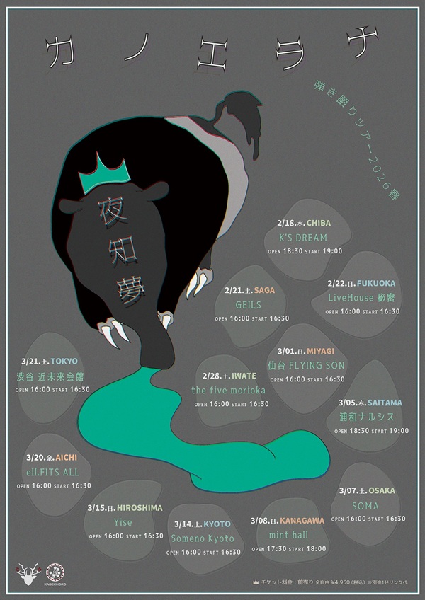 トップページ > 公演スケジュール > 公演情報詳細 カノエラナ カノエラナ 弾き語りツアー2026春「夜知夢」 2026/03/01(日) 開場16:00|開演16:30 LIVE HOUSE 仙台FLYING SON 会場情報 券種・料金 全自由 ¥4,950 ※入場時ドリンク代別途必要 *転売チケット入場不可。 *未就学児入場不可。12歳以下は保護者同伴の上、チケット購入の上入場可。 一般発売 [2026/01/17(土)] ローソンチケット (Lコード:21627) チケットぴあ (Pコード:317-216) e+(イープラス) お問い合わせフォーム:https://www.gip-web.co.jp/t/info※平日10:00~18:30対応※2~3営業日お時間を頂戴する場合がございます。※ドメイン指定受信、メール指定受信ご利用の方は、「@tayori.com」の受信設定をお願いいたします。※1週間以上お待ちいただいても返答がない場合は、受信設定を変更していただくか、別のアドレスから再度ご連絡ください。 ツイート