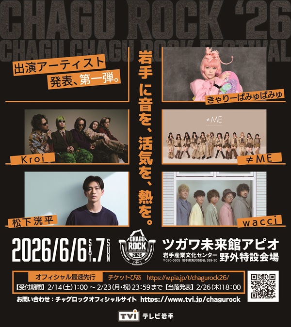 トップページ > 公演スケジュール > 公演情報詳細 CHAGU CHAGU ROCK FESTIVAL 2026 CHAGU CHAGU ROCK FESTIVAL 2026 このフェスについて音楽と、この街がつながる場所音と自然が響き合う 岩手発の新たな音楽フェス 広く高い空の下、雄大な岩手山に見守られながら最高の音を響かせたい――その想いは、初開催から変わることなく、この地に息づいています。そして今、年に一度のこのフェスは、多くの人々の記憶に残る存在として、少しずつ根を張り始めました。これまで岩手ではなかなか出会えなかったアーティストたちの音に触れ、県外から訪れる音楽ファンと、地元の人々が同じ時間を共有し、歌い、踊り、笑い合う――世代や立場を越えて生まれる一体感が、このフェスの風景です。音楽が人を動かし、街に活力をもたらす。その力を信じて、私たちは3回目の開催に挑みます。未来に向けて、より魅力的で、より活気あふれる岩手を創っていくために。「チャグチャグ馬コ」のように、時代を越えて、長く人々に愛される音を奏でたい。この街に、次の世代へ受け継がれる音楽の物語を根づかせたい。そんな願いを込めて、CHAGU CHAGU ROCK FESTIVALは今年も開催します。皆さまとこの場所でお会いできる日を、心待ちにしております。 2026/06/06(土) 開場**:**|開演**:** ツガワ未来館アピオ岩手産業文化センター 野外特設会場 会場情報 券種・料金 一般発売 発売詳細未定 2026/06/07(日) 開場**:**|開演**:** ツガワ未来館アピオ岩手産業文化センター 野外特設会場 会場情報 券種・料金 一般発売 発売詳細未定 アーティストきゃりーぱみゅぱみゅ/Kroi/≠ME/松下洸平/wacci ツイート